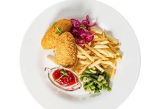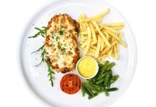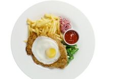360 г • Филе свинины, маринованное во Французской заправке и обжареное в сухарях Панко. Подается с картофелем Фри, маринованным луком, стручковой фасолью, обжаренной с чесноком, яйцом и соусом Чили