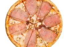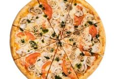 32 см/450-550 г • Балык сырокопченый, шампиньоны, томатный соус, моцарелла, чесночное масло, орегано