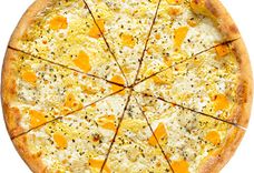 32 см/450-550 г • Бекон, сливочный соус, сыр Грана Падано, моцарелла, чесночное масло, орегано