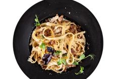 380 г • Макароны Феттучини в сливочном соусе с грибами, карамельным луком и сыром Грана Падано