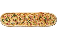 1700-1800 г • Бекон, сливочный соус, сыр Грана Падано, моцарелла, чесночное масло, орегано, листья рукколы