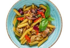 350 г • Макароны Пенне, цыпленок барбекю, стручковая фасоль, шампиньоны, лук, перец чили, бульон куриный, сыр Грано Падано, соус Терияки, зелень базелика